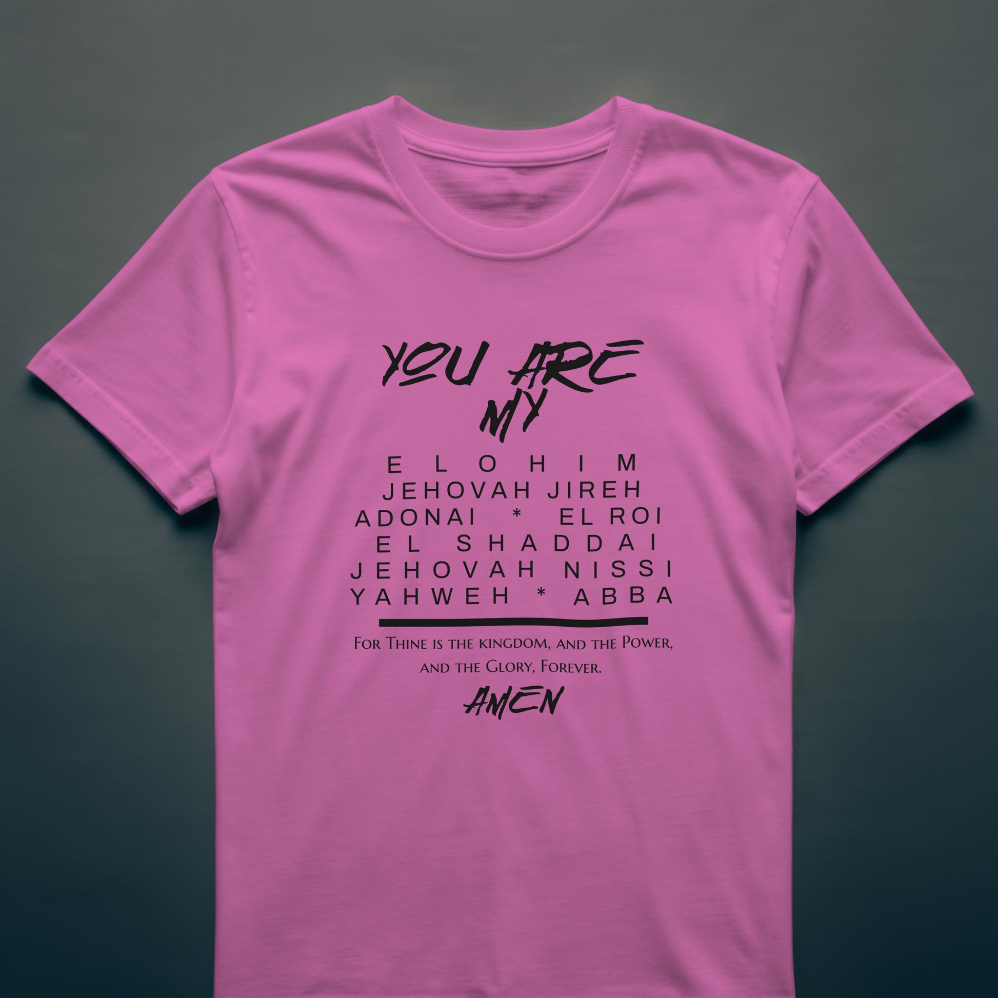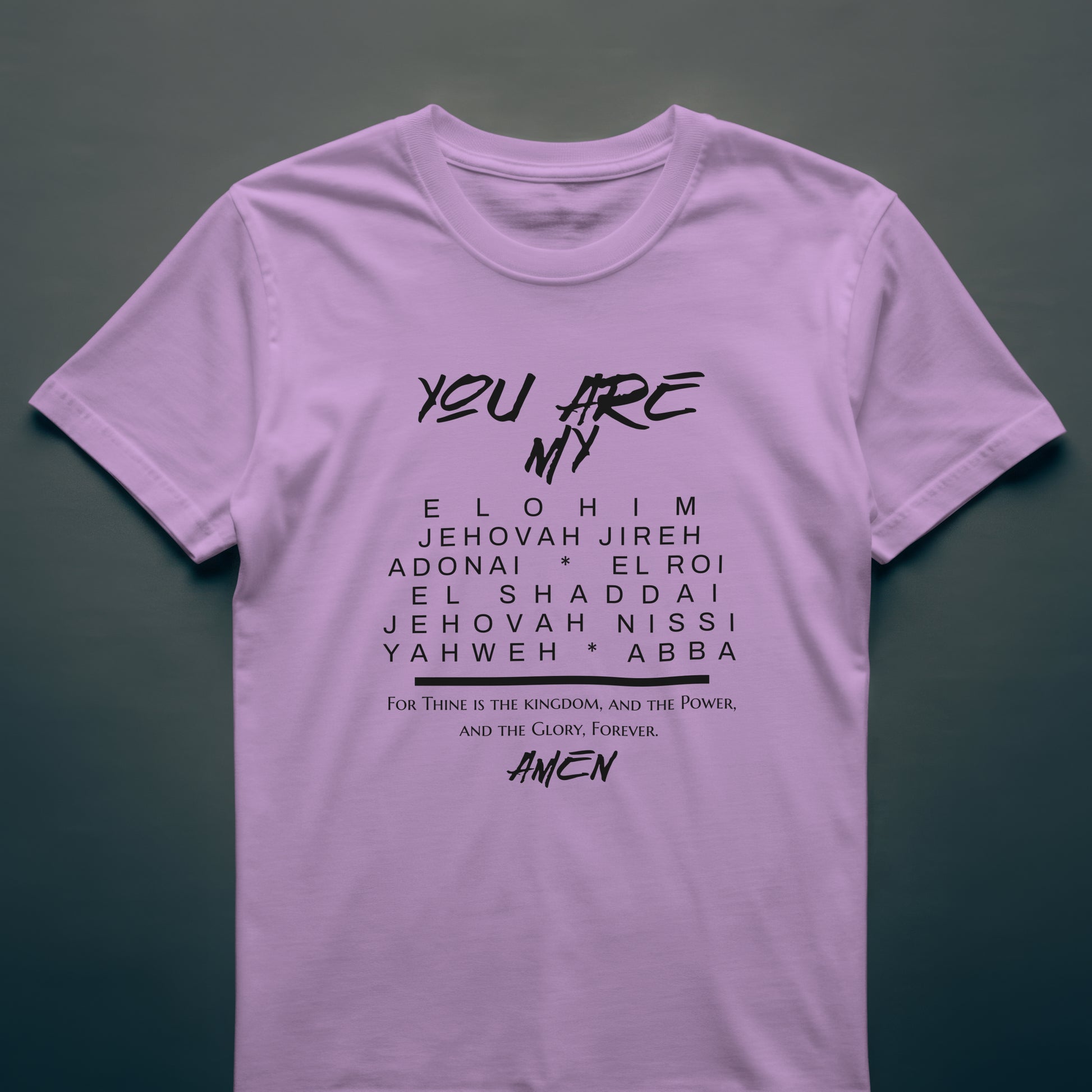 Express your faith proudly with the "You Are My" Women's Tee, adorned with meaningful names of God that highlight His love and presence. Designed for both comfort and style, this tee is ideal for everyday wear or thoughtful moments of devotion. Wear a piece that inspires your spiritual path and lifts your soul.